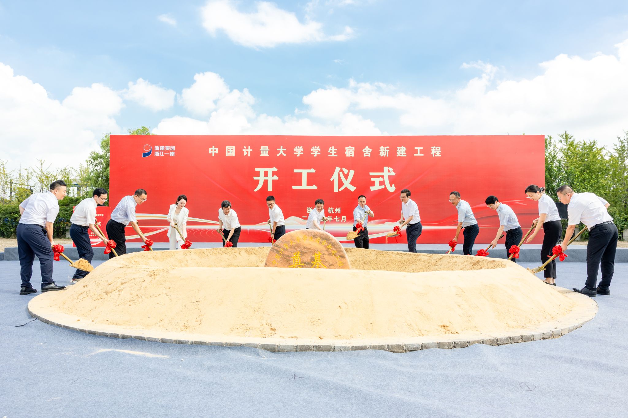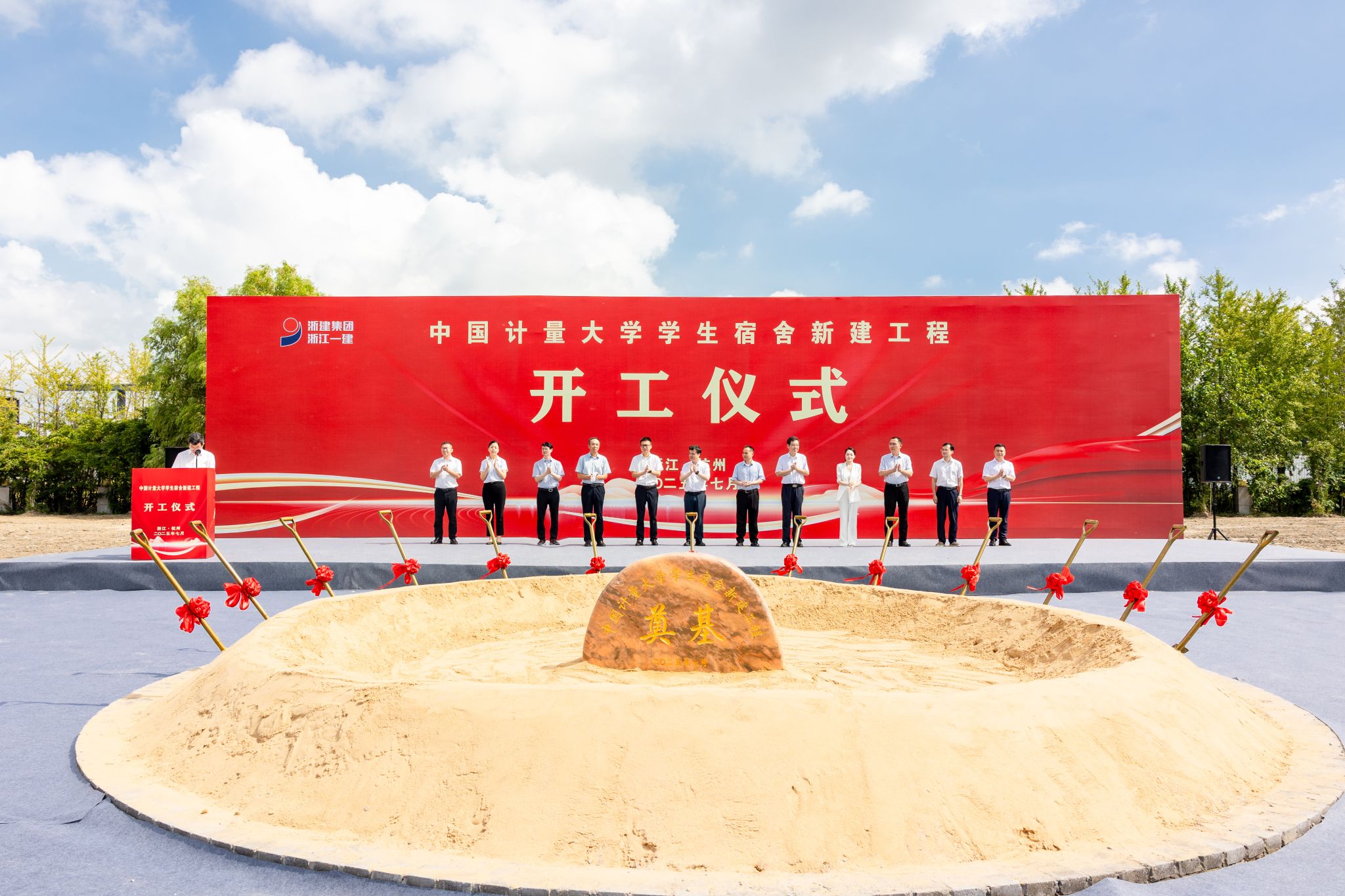 7月23日上午,中国计量大学学生宿舍新建工程正式开工。钱塘新区党工委委员、钱塘区委常委周妙荣,钱塘区住建局党委委员、副局长黄成,杭州钱塘科学城管理办公室副主任韩翠华;校党委书记徐江荣,党委副书记、副校长(主持行政日常工作)戴道锌,党委副书记程刚,纪委书记马春波,副校长王乐,党委委员、宣传部部长陈永强等校领导班子成员出席开工仪式;学校相关职能部门负责人,以及设计、监理、施工、勘察、全过程跟踪审计、造价咨询等单位代表参加仪式。仪式由副校长王迪钊主持。