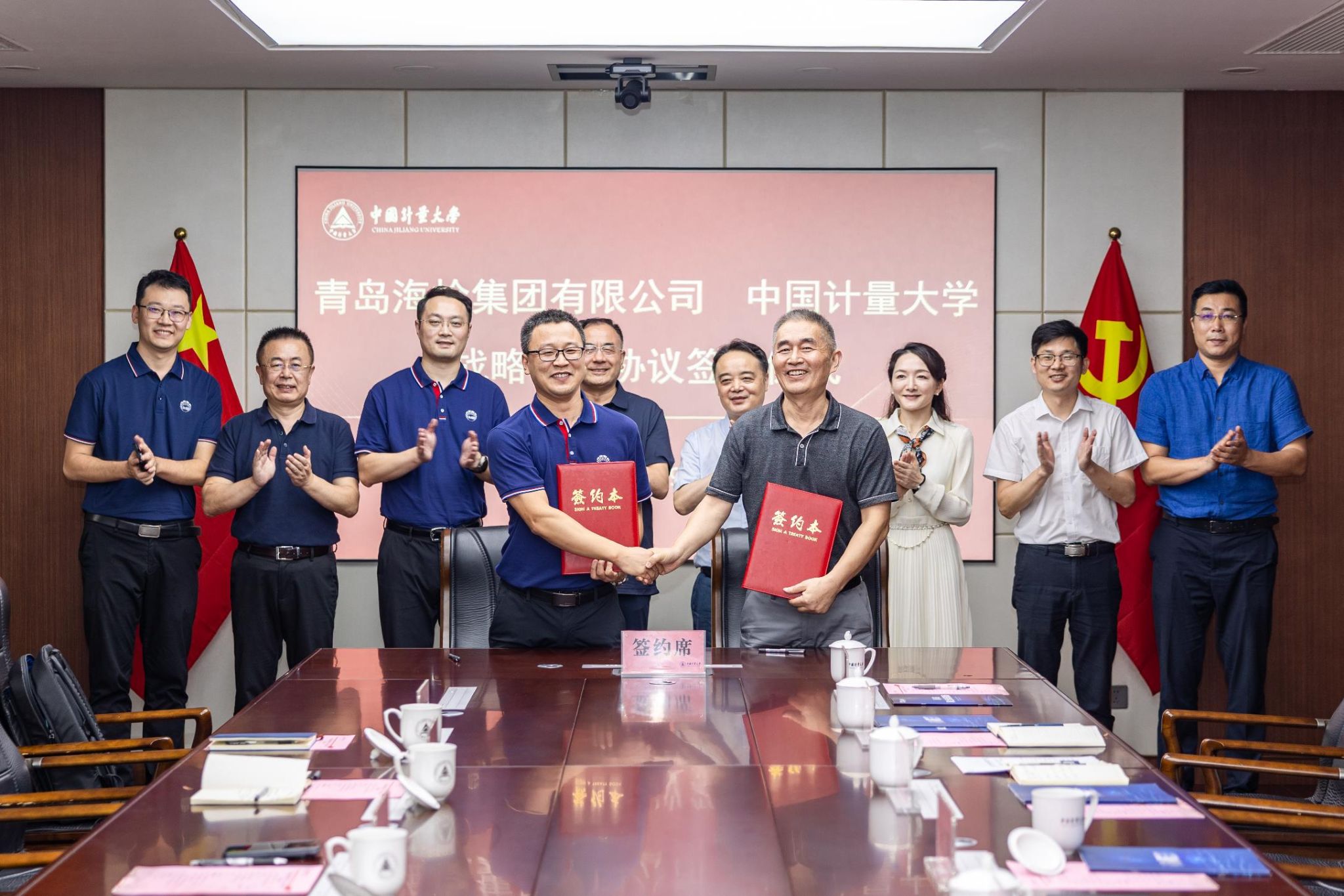 青岛海上综合试验场有限公司总经理石鹏与中国计量大学教育部原位计量重点实验室主任王月兵在双方领导见证下签署战略合作协议。